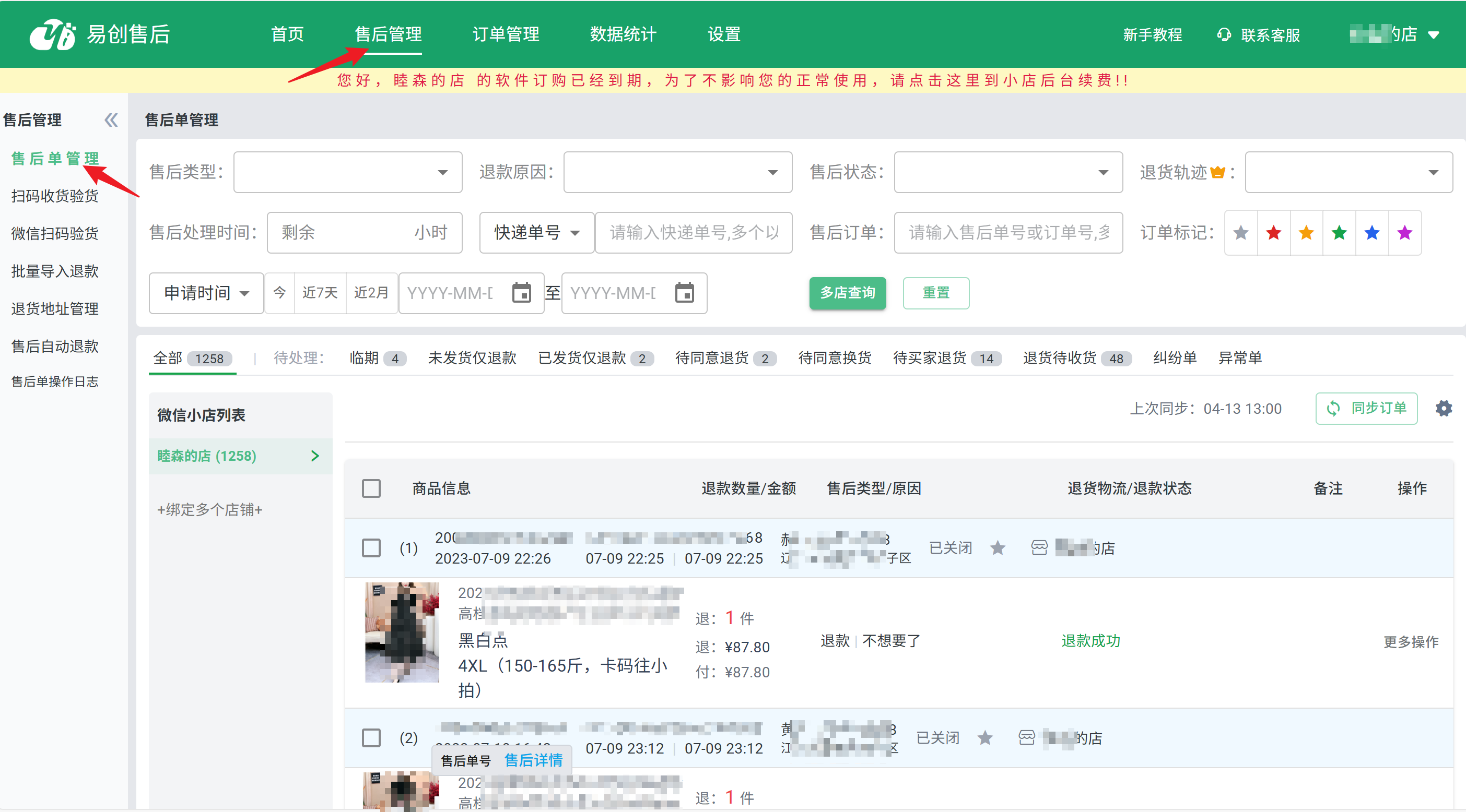 目录 搜索 展开 易创售后使用教程订购易创售后登录易创售后售后订单管理扫码收货验货微信扫码验货退货地址管理售后自动退款多店铺管理快递授权管理批量导入退款数据数据分析干货分享爆单时如何高效处理售后单升级公告 暂无相关搜索结果! 阅读次数:175 本文档使用 MinDoc 发布 售后订单管理 步骤一:登录系统首先,确保您已使用正确的账号登录至易创售后管理平台。步骤二:查看售后列表登录后,点击首页左侧栏的“售后管理”按钮,您将看到所有待处理的售后订单列表。这里会详细展示订单编号、客户信息、申请原因及时间等关键信息。也可以按条件筛选售后订单,如:临期、未发货仅退款、已发货仅退款、退货待收货,纠纷单、异常单等。作者:易创售后 创建时间:2024-06-17 10:11最后编辑:admin 更新时间:2025-11-19 08:54