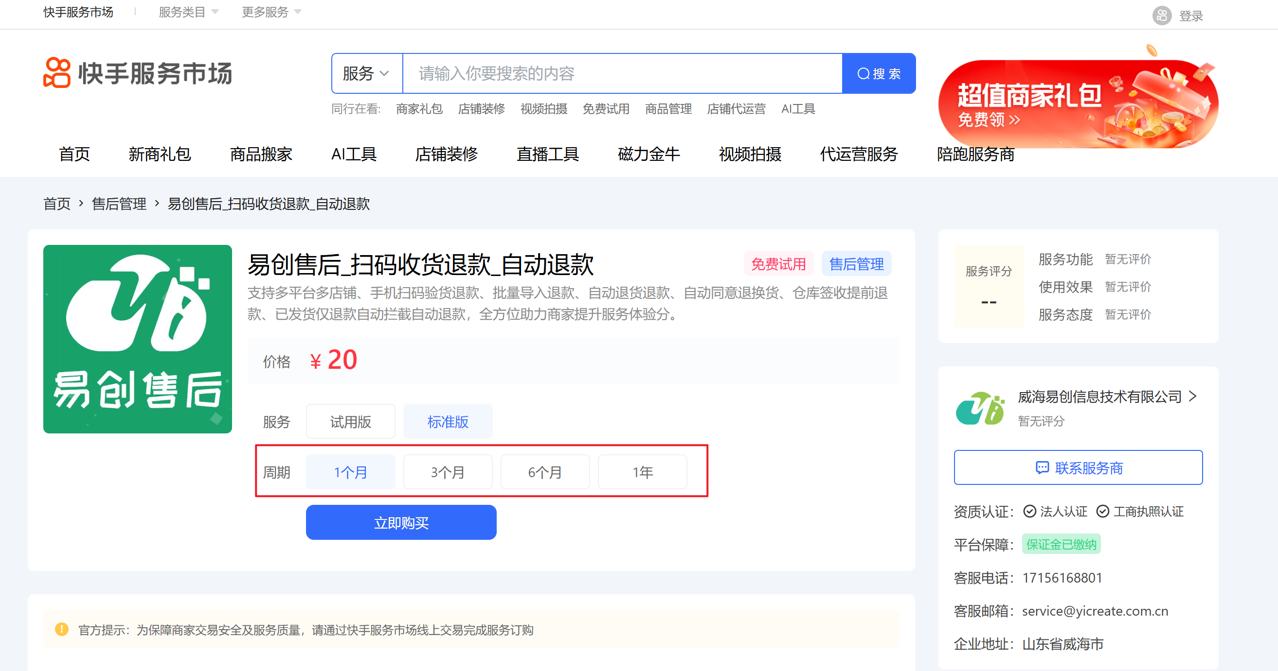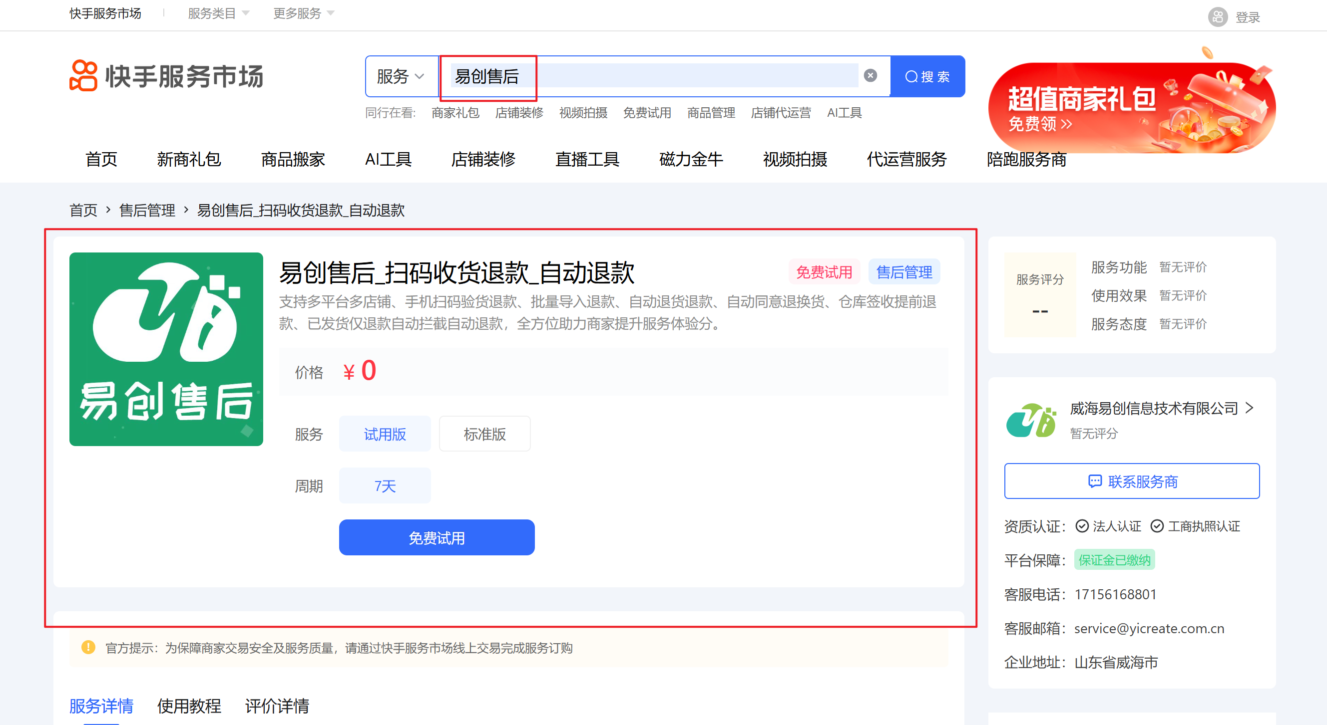 订购地址(请用浏览器打开网址):https://fuwu.kwaixiaodian.com/new/detail?id=24244925691640 快手小店【服务市场】,搜索“易创售后”,选择服务和周期订购即可 作者:易创售后 创建时间:2024-06-28 08:23最后编辑:admin 更新时间:2025-11-19 08:54