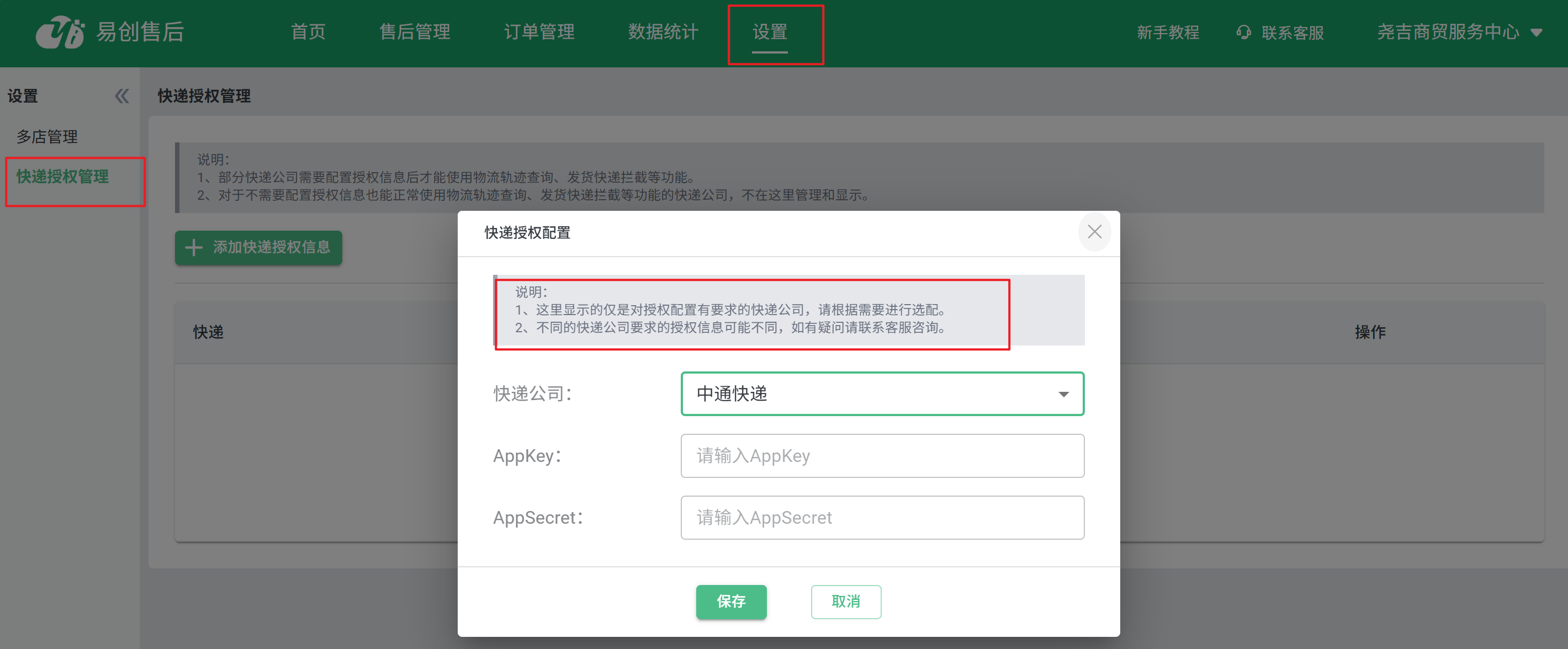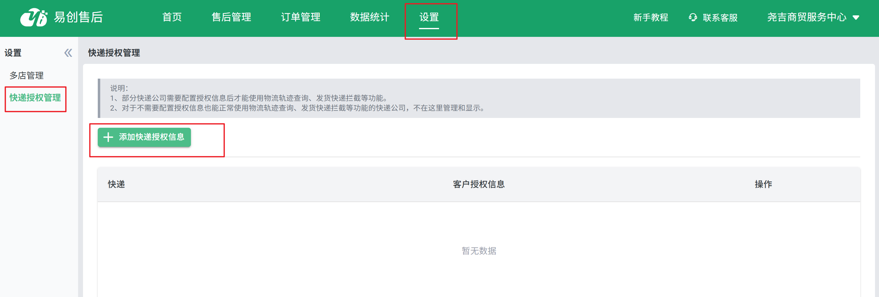 目录 搜索 展开 易创售后使用教程订购易创售后登录易创售后售后订单管理扫码收货验货微信扫码验货退货地址管理售后自动退款多店铺管理快递授权管理批量导入退款数据数据分析干货分享爆单时如何高效处理售后单升级公告 暂无相关搜索结果! 阅读次数:40 本文档使用 MinDoc 发布 快递授权管理 路径:设置 > 快递授权管理1、部分快递公司需要配置授权信息后才能使用物流轨迹查询、发货快递拦截等功能。 2、对于不需要配置授权信息也能正常使用物流轨迹查询、发货快递拦截等功能的快递公司,不需要在这里管理和显示。 作者:admin 创建时间:2025-04-30 14:38最后编辑:admin 更新时间:2025-11-19 08:54