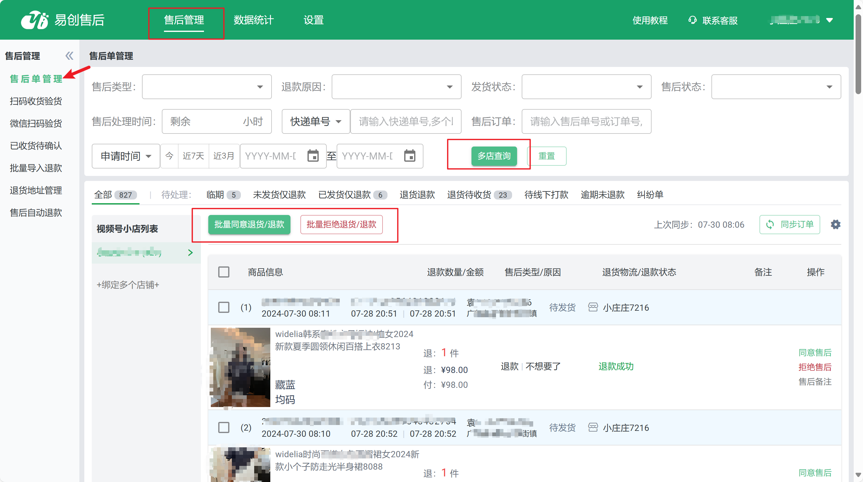 目录 搜索 展开 易创售后使用教程订购易创售后登录易创售后售后订单管理扫码收货验货微信扫码验货已收货待确认退货地址管理售后自动退款多店铺管理批量导入退款数据数据分析干货分享爆单时如何高效处理售后单升级公告 暂无相关搜索结果! 阅读次数:155 本文档使用 MinDoc 发布 售后订单管理 步骤一:登录系统首先,确保您已使用正确的账号登录至易创订单售后管理平台。步骤二:查看售后列表登录后,点击首页左侧栏的“售后管理”按钮,您将看到所有待处理的售后订单列表。这里会详细展示订单编号、客户信息、申请原因及时间等关键信息。也可以按条件筛选售后订单,如:临期、未发货仅退款、已发货仅退款、退货待收货,纠纷单等。作者:易创售后 创建时间:2024-06-17 10:11最后编辑:易创售后 更新时间:2025-04-11 08:32