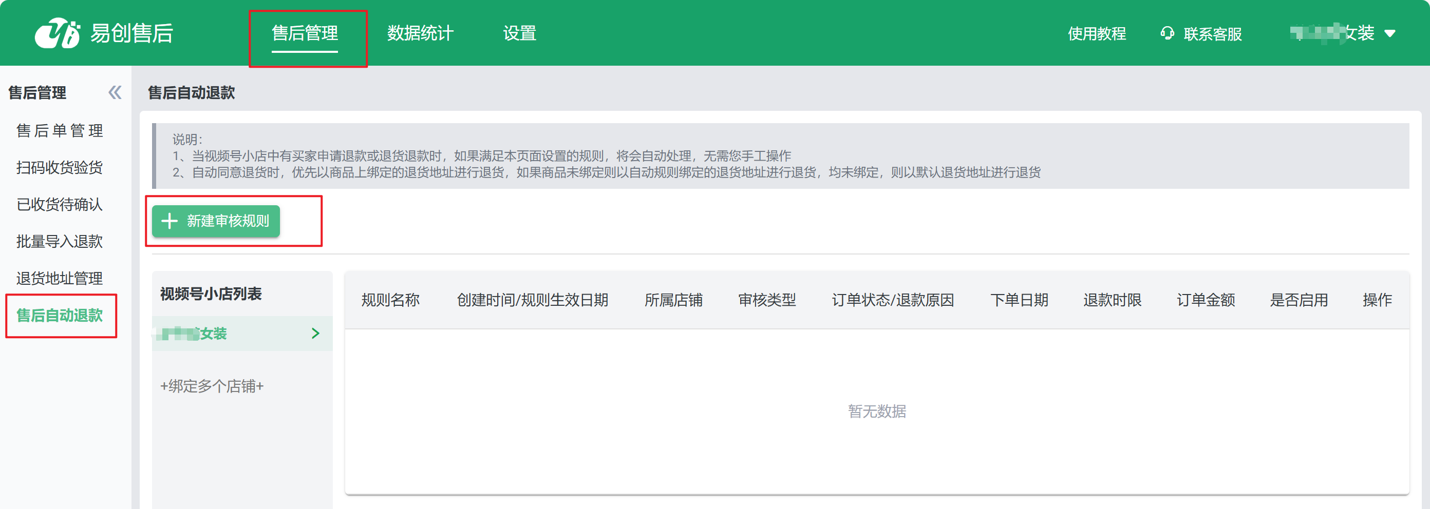 目录 搜索 展开 易创售后使用教程订购易创售后登录易创售后售后订单管理扫码收货验货微信扫码验货已收货待确认退货地址管理售后自动退款多店铺管理批量导入退款数据数据分析干货分享爆单时如何高效处理售后单升级公告 暂无相关搜索结果! 阅读次数:79 本文档使用 MinDoc 发布 售后自动退款 路径:售后管理 >售后自动退款开启“自动退款”功能,当退货订单被确认收货后,系统将自动执行退款操作,减少手动处理环节,提升效率。作者:易创售后 创建时间:2024-06-17 13:23最后编辑:易创售后 更新时间:2025-04-11 08:32